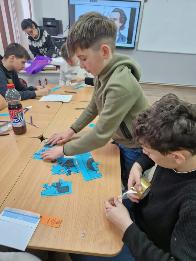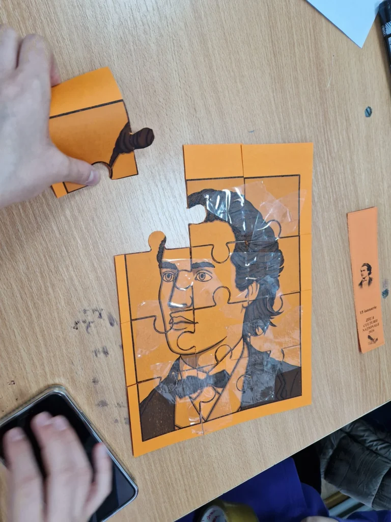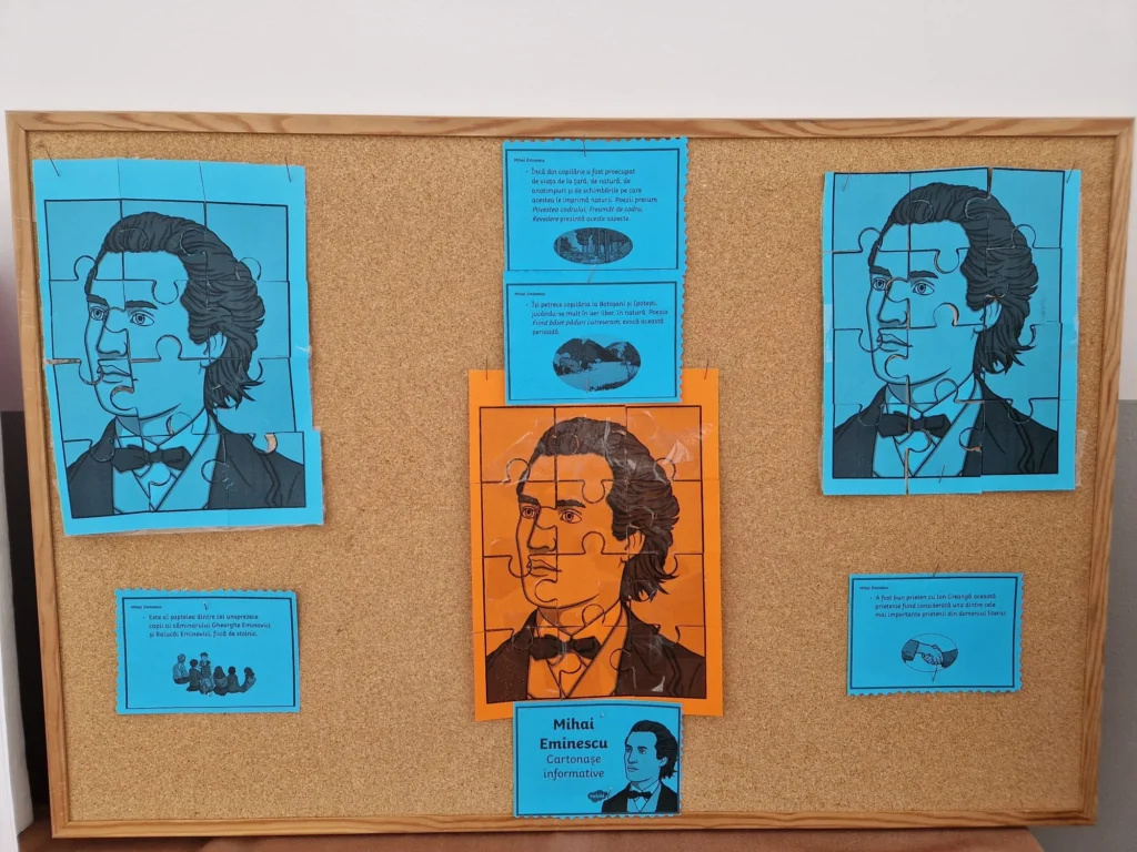 Elevii creează concepte grafice pentru obiecte moderne inspirate de simbolurile eminesciene (teiul, luna, lacul etc.), apoi cele 3 grupe realizează puzzle-ul, reconstituind chipul lui Eminescu.
